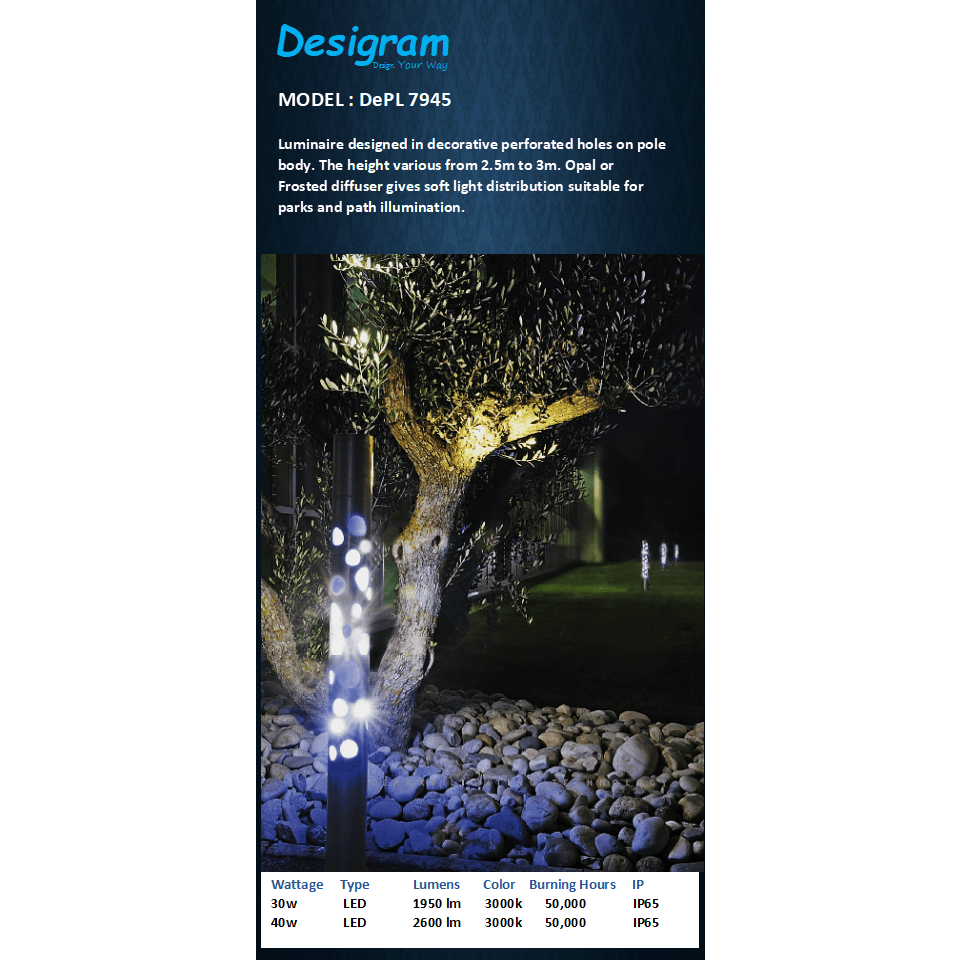 Luminaire designed in decorative perforated holes on pole body. The height various from 2.5m to 3m. Opal or Frosted diffuser gives soft light distribution suitable for parks and path illumination.