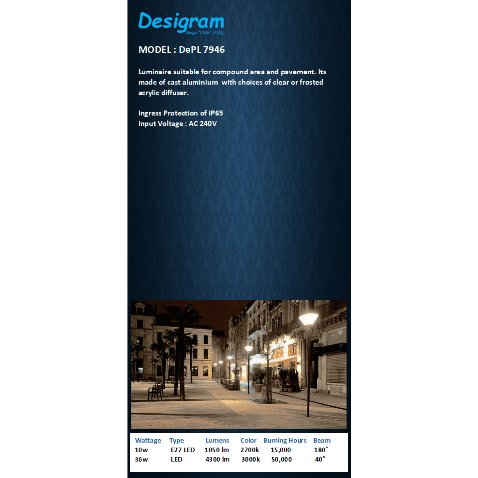 Luminaire suitable for compound area and pavement. Its made of cast aluminium with choices of clear or frosted acrylic diffuser.