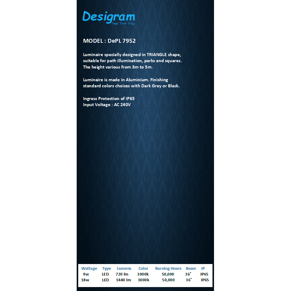 Luminaire specially designed in TRIANGLE shape, suitable for path illumination, parks and squares. The height various from 3m to 5m.