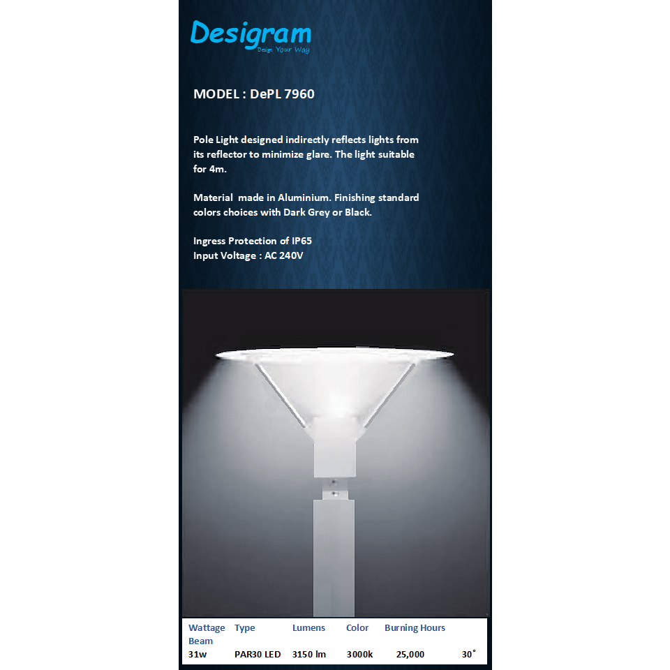 Pole Light designed indirectly reflects lights from its reflector to minimize glare. The light suitable for 4m.
